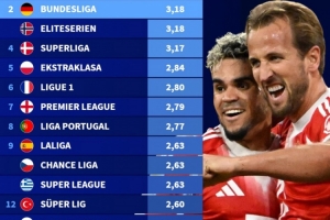 本赛季欧洲前15大联赛场均进球:德甲3.18球第2,英超2.79球第7