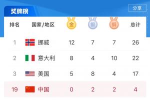 还剩48金!冬奥奖牌榜:中国2银2铜第19,第1挪威12金、意大利8金