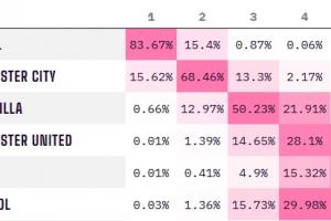 争冠集团方面,阿森纳赢下北伦敦德比后,夺冠概率回升至83.67%,曼城则是15.62%。维拉有高达50.23%的概率在赛季末排名第三。
