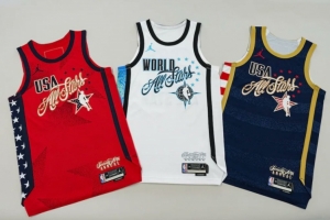其中美国队包含两款球衣:一款饰有星形图案的红色球衣,以及一款带有条纹元素的蓝色球衣。世界队则采用以地球图案点缀的白色球衣。这三款由Jordan品牌特别设计的球衣,背面号码上方均将印有球员所属国家的国旗。这款命名为"Jordan品牌NBA全明星赛球迷版球衣"的产品,将于美国东部时间周三上午10点在NBA官方商店和耐克官网同步发售。